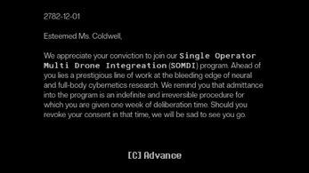 Holy shit this is so sick! The controls feel so mechanical and meticulous it was easy to feel you were operating a drone, love that so much. The environment was so evocative, the spaces were so varied and full of character and the lighting made it feel so abandoned and mysterious. What a vibe. The writing is fantastic, and frustratingly realistic and heartbreaking, and the ending is all of those things as well. The vapid corporate speak never fails to rile me up lol. The sound design was also really nice adding to the abandoned and mechanical atmosphere, the occasional haunting moan echoing through the place was also fitting especially by the end.